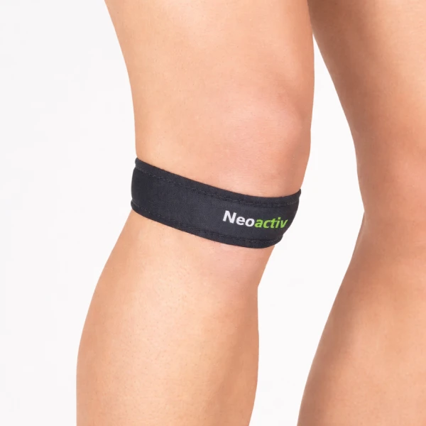 Cincha infrapatelar de neopreno que ha sido diseñada para ofrecer una compresión localizada sobre el tendón rotuliano, lo que ayuda a reducir la tensión mecánica en su punto de inserción distal.