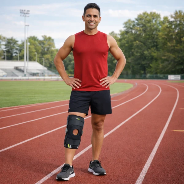 Rodillera estabilizadora con articulaciones policéntricas ajustables, pensada para ofrecer un control progresivo del rango de movimiento durante procesos de rehabilitación ligamentaria y postquirúrgica.