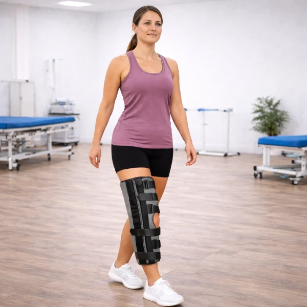 Inmovilizadora de rodilla de tres paneles, diseñada para ofrecer una protección y control total de la articulación, especialmente en fases agudas o después de una cirugía.